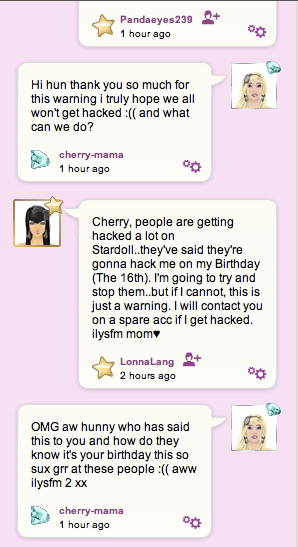 I also even got a comment saying I was 13th on the hack list and receive many more comments of people claiming to have been hacked from the notorious mafia!! I honestly could care less if I do get hacked, I can always create another account. I've never wasted a cent on Stardoll, especially seeing that Stardoll has yet to create a system that can secure your account. I feel bad for those people who spent a lot of money on their accounts and have been hacked. Now, that the supposed mafia is back everyone is in a panic!! Stardoll is getting seriously insane right now and every one is running to nowhere!!!